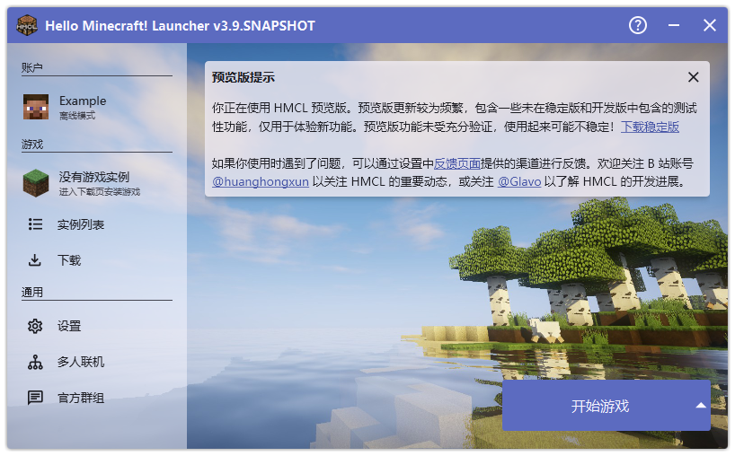 如果你尚未安装任何实例(即未安装过任何游戏版本),可以直接点击 「开始游戏」。HMCL 会自动安装最新正式版 Minecraft 并启动游戏。